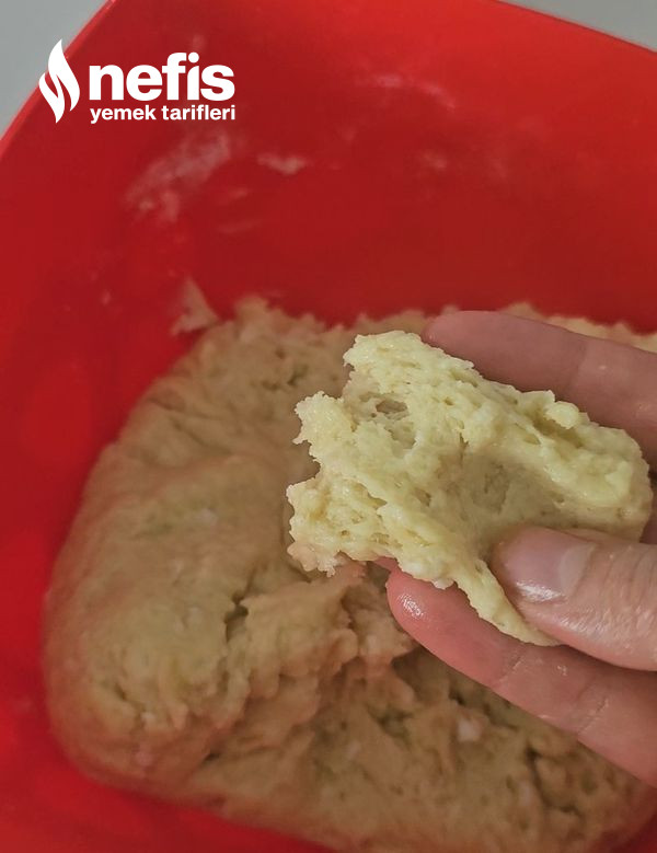- 2 bardak un ekleyip kaşıkla karıştırıp elimize alalım. Çok fazla ezmeden harmanlayıp yoğuralım.