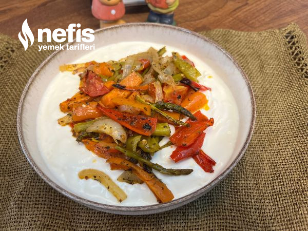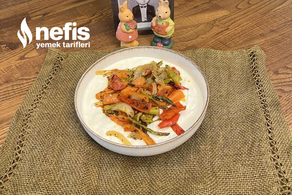 8. Fırından çıkarılan sebzeler ılıyınca yoğurtlu karışımın üzerine konulup servis yapılır.