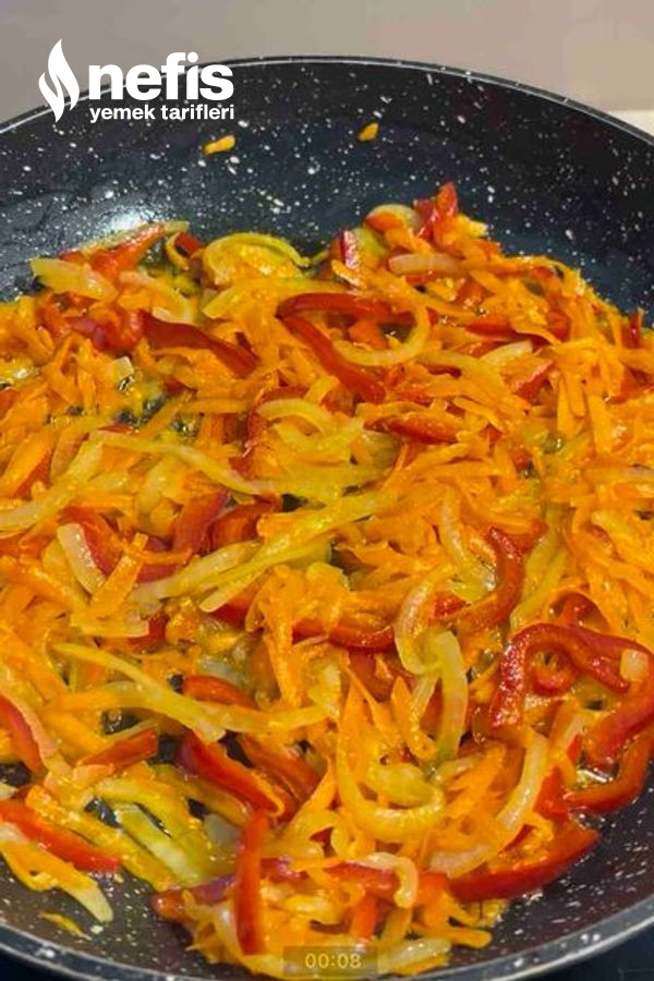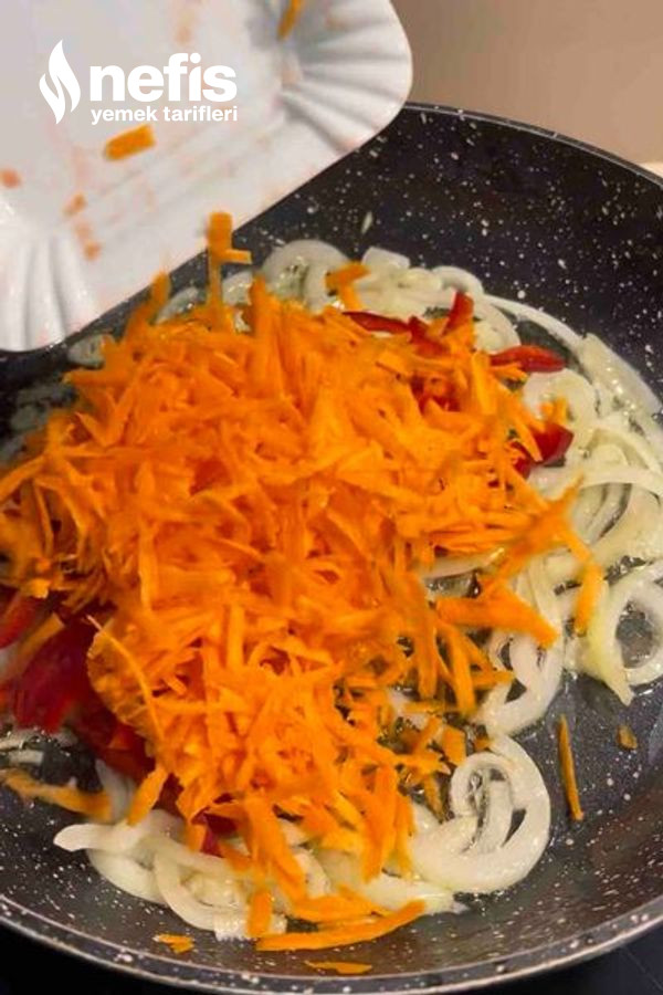5. Ardından biber ve havuçları ekleyin, yumuşayana kadar karıştırarak pişirin.