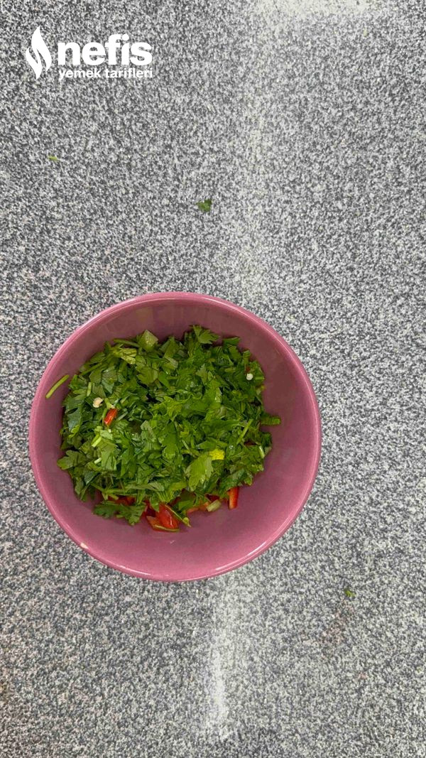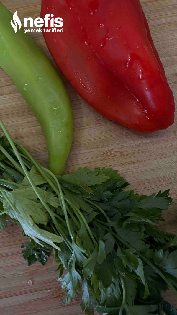 3. Maydanoz ve biberleri ince ince keselim. Biberleri mümkün olduğunca küçük kesin içerisinde canlı kalmasın. Sucuğu ince ince keselim.