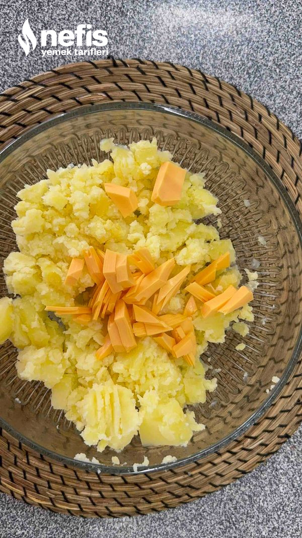 5. Patatesler haşlanınca bir kasede çatalla ezelim. Üzerine cheddar peyniri ve tuz ekleyip karıştıralım.