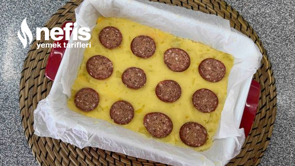 6. Fırın kabına pişirme kağıdı üzerine patatesleri alalım. Üzerine sucukları dizelim.