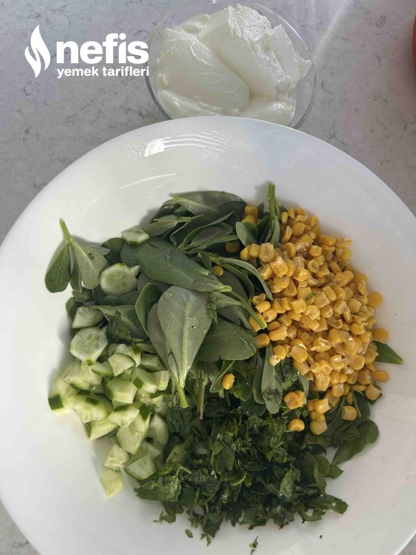 - Derin bir kaseye alalım ,ardından salatalığı doğrayalım, taze naneyi doğrayalım ,mısırı ekleyelim.