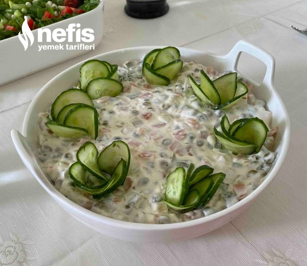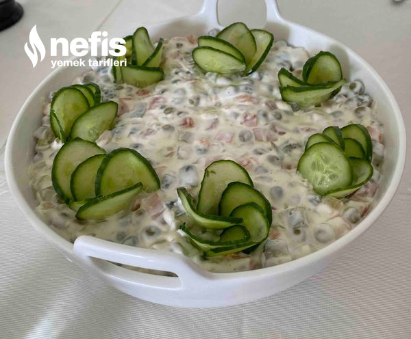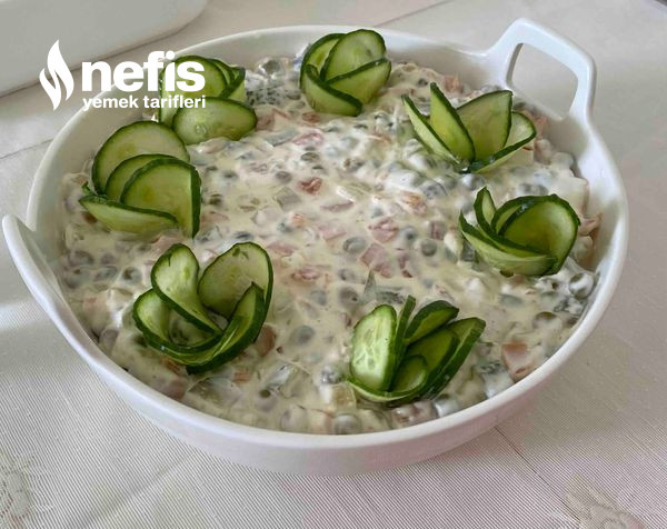 2. Ayrı bir kapta süzme yoğurdu, olağan yoğurdu, mayonezi, sarımsağı, tuz ve karabiberi karıştırıyoruz yoğurt karışımının içine haşlanmış suyu süzülmüş zerzevatları ve kornişon turşusunu ek edip, hepsini karıştırıyoruz.