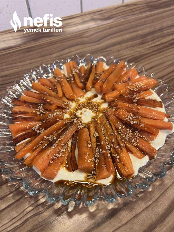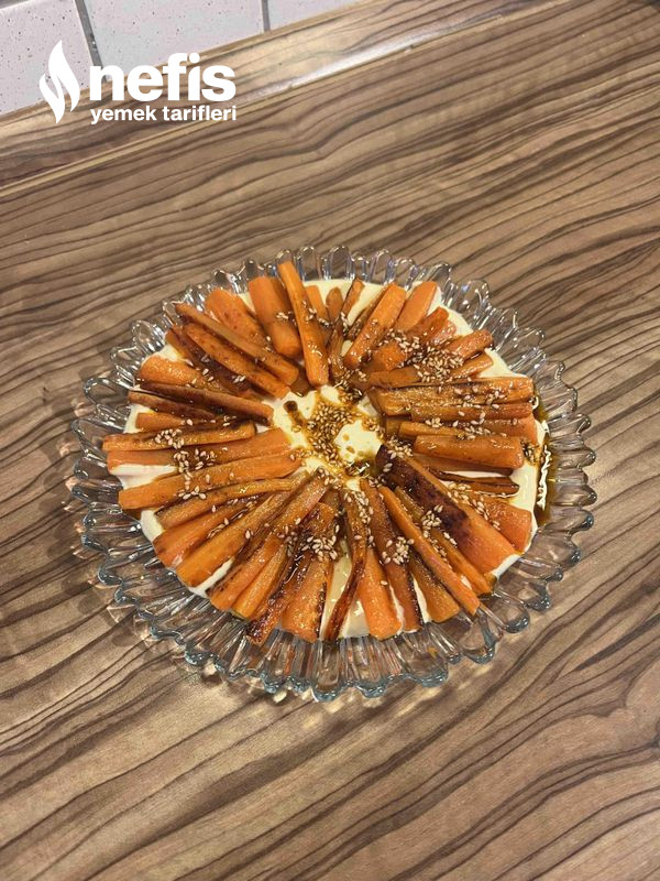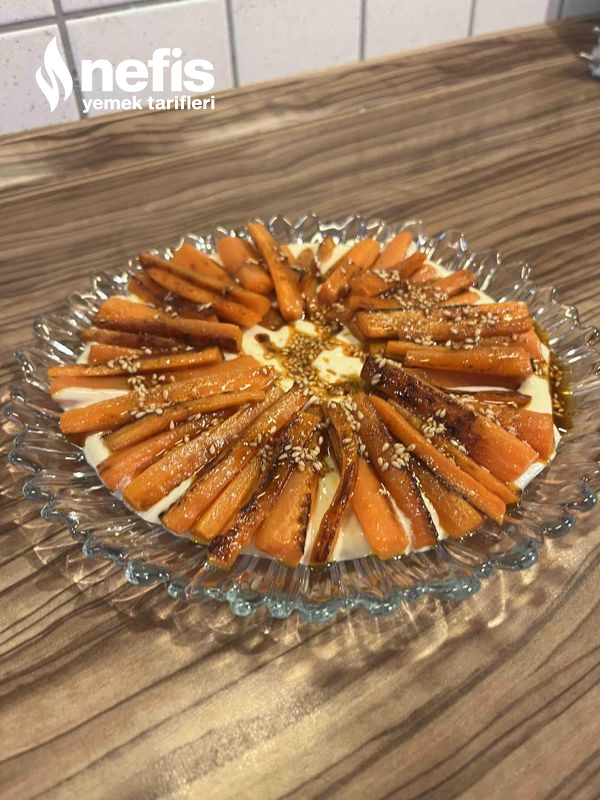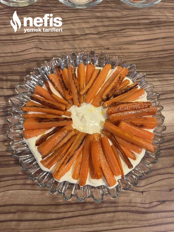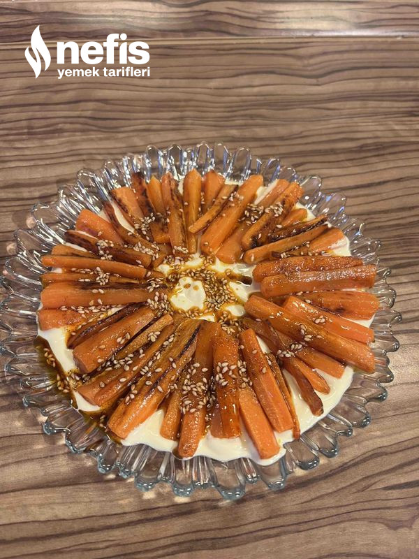 5. Kızartmış olduğumuz havuçları yoğurtlu sosumuzun üzerinde dizelim.