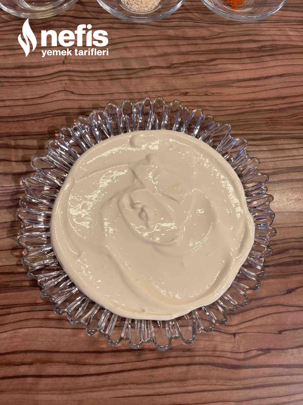 4. Yoğurtlu sos için yoğurt, rendelenmiş sarımsak, hardal, bal ve biraz tuz karıştırıp servis edeceğimiz tabağa alalım.