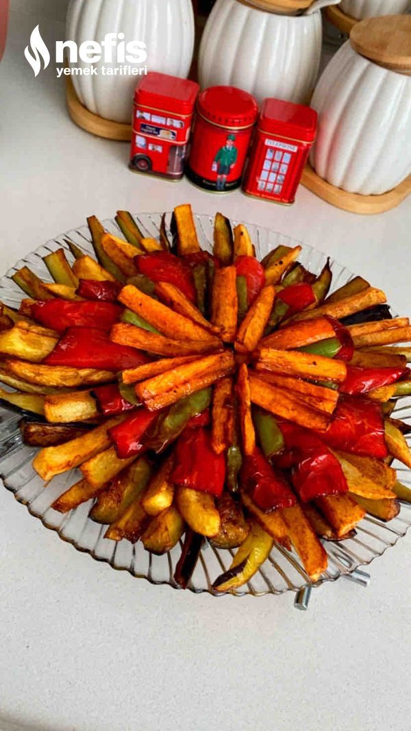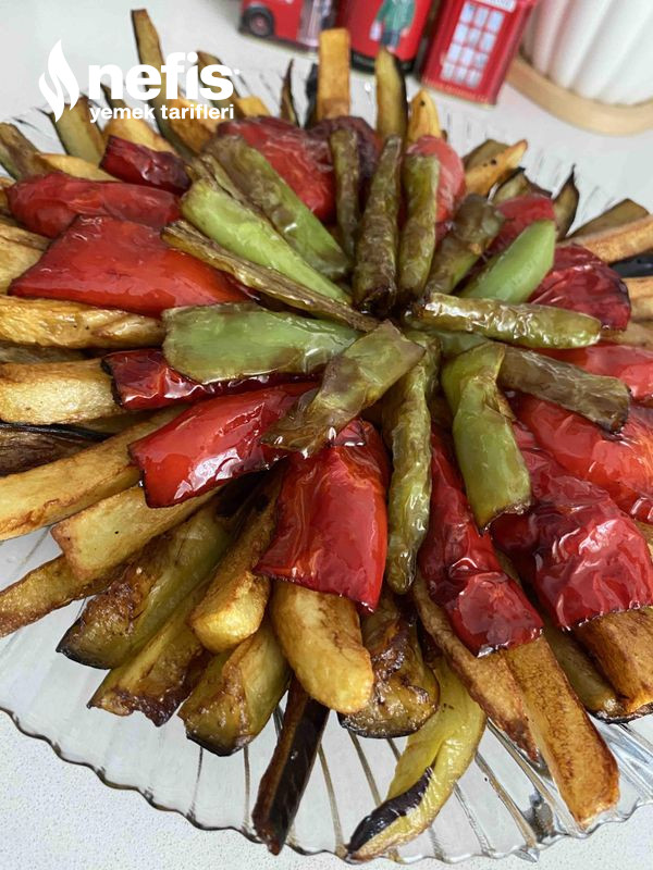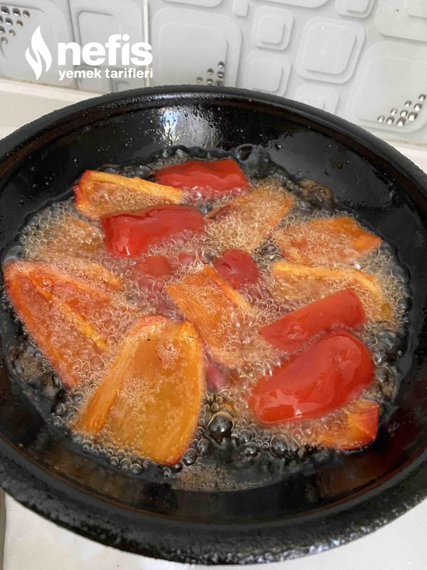2. Kapya biber ve yeşil biber de kızartalım uygun bir servis tabağına sırayla kızarttıktan sonra şekillendirelim.