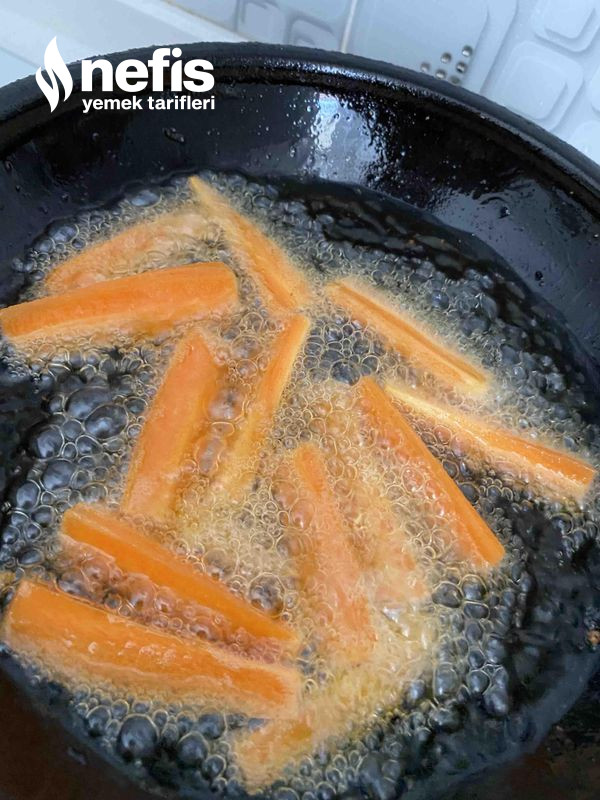 1. Sebzelerin patlıcan, havuç ve patatesleri soyup istediğiniz halde doğrayıp, yağda kızartalım.