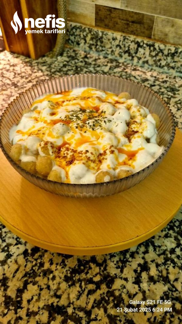 - Daha sonra servis tabağına alıp üzerine sarımsaklı yogurdu döküyoruz.