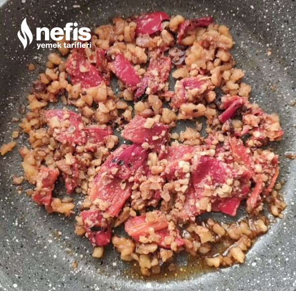 4. Biberleri, baharatları ve cevizi ek edip 1-2 dakika orta ara karıştırın,ocaktan alın.
