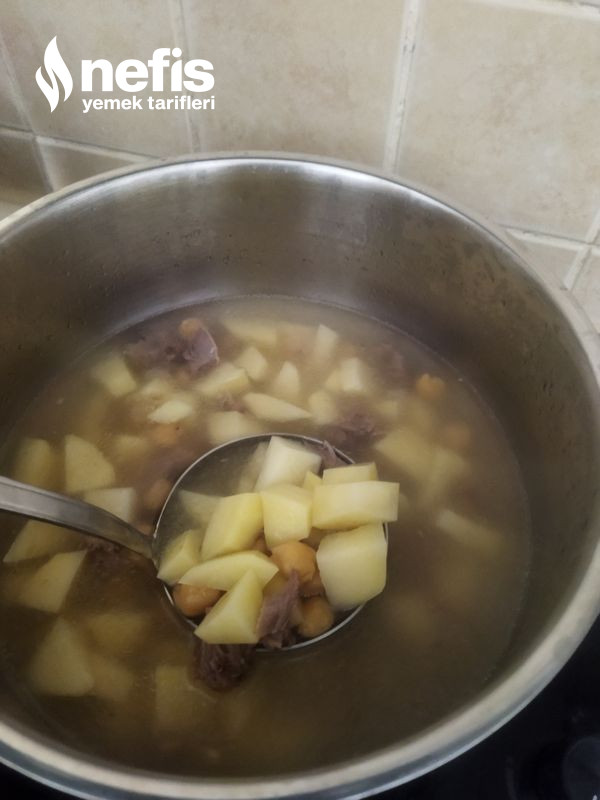 3. Daha sonra başladığımız et nohuta patateslerimizi küp küp doğrayıp tencereye koyuyoruz et nohut suyunda patateslerimizi haşlıyoruz.