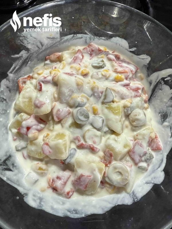 3. Başka bir derin kapta yoğurt ve mayonezi karıştıralım üzerine doğradığımız materyalleri ve haşlanan patateslerimizi ekleyelim, patateslerin soğuk olması değerli zira yoğurdun kesilmemesi için.