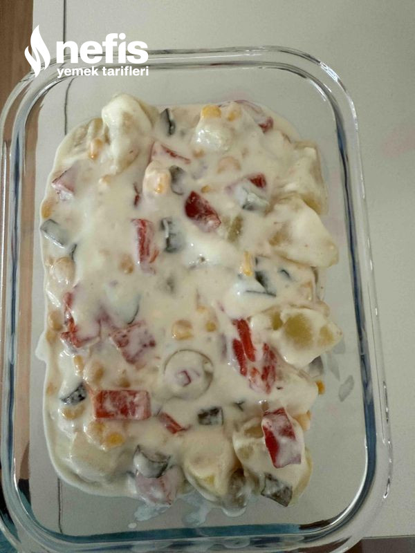 2. Kornişon turşularımızı, kapya biberlerimizi, yeşil zeytinlerimizi doğrayıp derin bir kabın içine alalım üzerine haşlanmış mısırlarımızı ekleyelim ve karıştıralım.