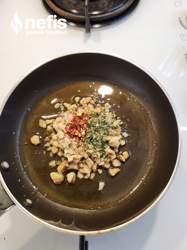 5. Küçük bir tavada zeytinyağı, pul biber, nane ve ceviz biraz kavrulur.