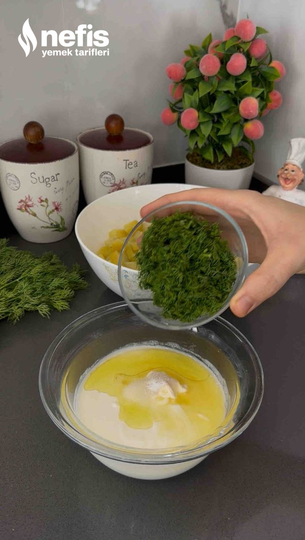 - Diğer yandan bir kasede yoğurt, mayonez, limon suyu, zeytinyağı, tuz ve ince kıyılmış dereotunu karıştırıp sos hazırlayın.