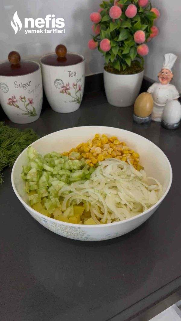 - Patatesleri haşlayın ve küp küp doğrayın. Soğanları piyazlık, salatalıkları da küp küp doğrayın. Mısırları da ekleyip salata gereçlerini harmanlayın.