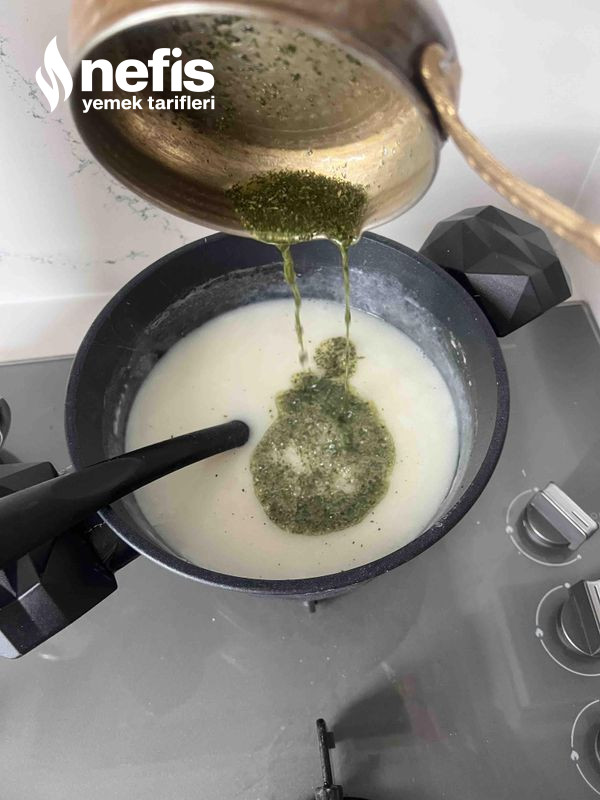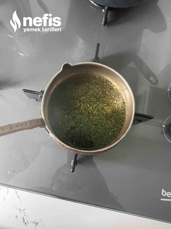 6. Bir yandan iki yemek kaşığı zeytinyağının yakıp, üzerine kuru nane ekliyoruz.