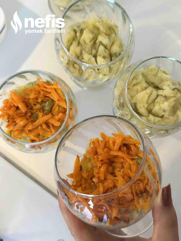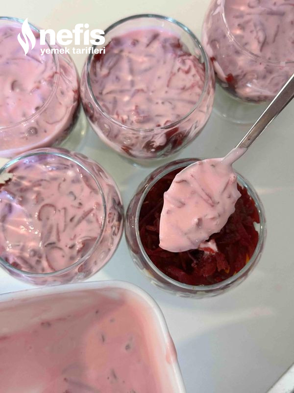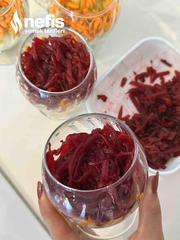 13. Uygun sunum kasemizin alt tabanına öncelikle patatesi, havucu, pancarı, yoğurdu sırasıyla ekleyelim.