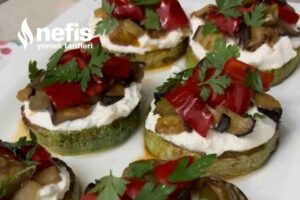 - Kabakları servis tabağına alalım üzerine yoğurdu sürelim kızarttığımız zerzevatları üzerine yerleştirelim en son maydanoz ile süsleyelim. Afiyet olsun.