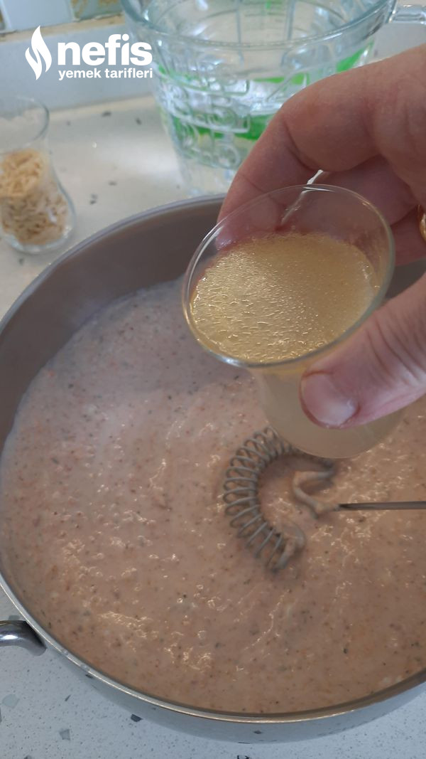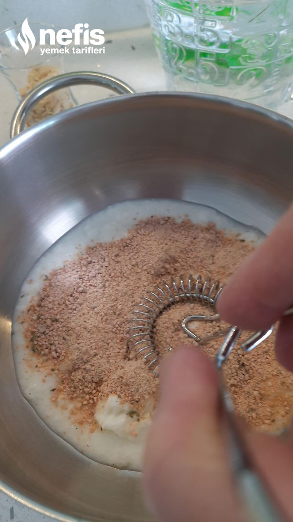 2. Daha sonra et suyu olağan suyu ekleyip çırpalım.