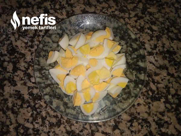 - Yumurtaları soyun ve yumurtaları fotodaki üzere dilimleyin ve yoğurdu bir kapta biraz karıştırın ve tuzu da ekleyip karıştırın .