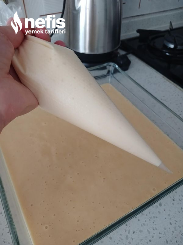 - Krema sıkma torbasına ya da rastgele bir buzdolabı poşetine konularak ucu ince olacak formda kesilip kekin üzerine fotoğrafta gösterdiğim üzere gezdirilir. Kare modüllere bölecek biçimde.