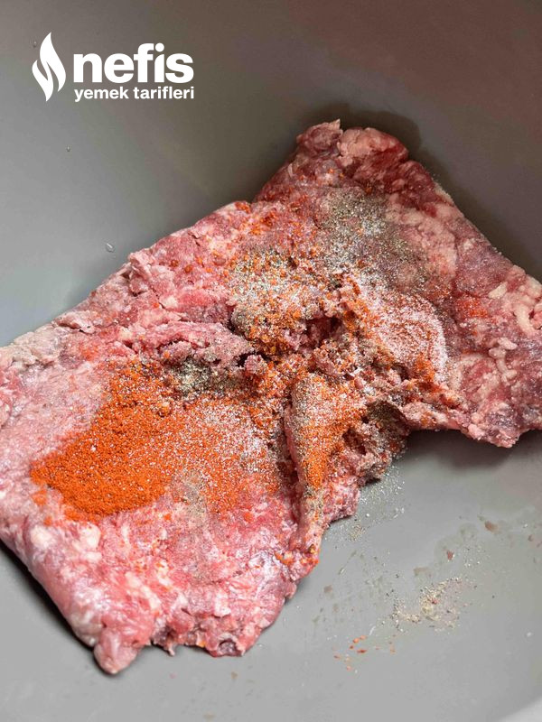 1. Öncelikle kıymamızı kabımıza alıp tuz, karabiber, toz kırmızı biber ve pul biber ekleyip yoğuralım.