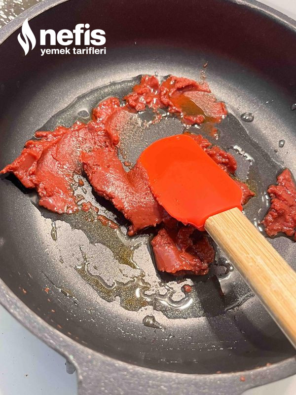 9. Salçamızı küçük bir tavaya alıp biraz sıvı yağ ve karabiber ekleyip, karıştıralım biraz sıvı bir hal alsın diye 2 yemek kaşığı su ekleyelim.