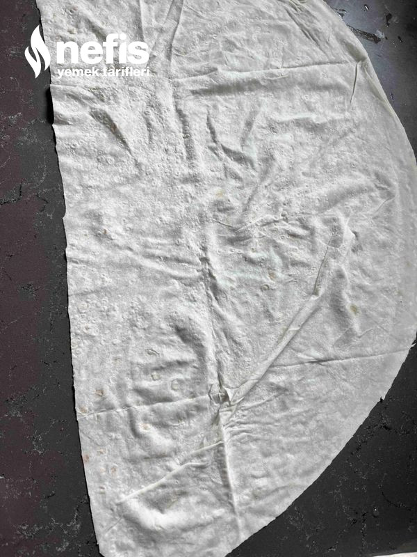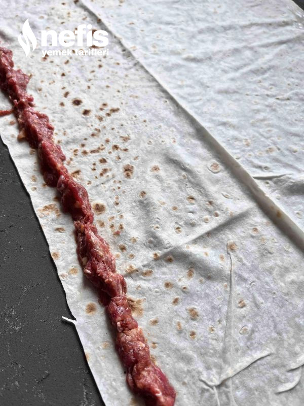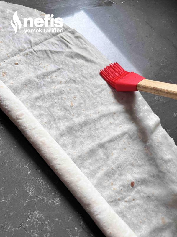 3. Tüm yufkaları ortadan ikiye bıçak yardımıyla ayıralım ve kıymalarımızı uzun şerit halinde çok kalın olmayacak biçimde yufkamızın üzerine serelim.