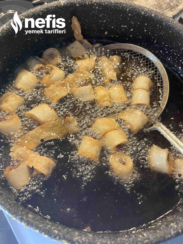 6. Kızartma tenceremizi ocağımıza alıp, kızdıralım ve kestiğimiz yufkaları kızgın yağa atalım.