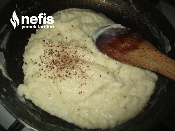 - Diğer tarafta tavaya yağları koyalım unu koyalım. Kısık ateşte hafif unun kokusu çıkana kadar kavuralım. Sonra sütü ek edip karıştıralım. Kıvam alana biraz pişirelim muskat rendesi, tuz, karabiber serpip karıştıralım. Ocağın altını kapatalım.