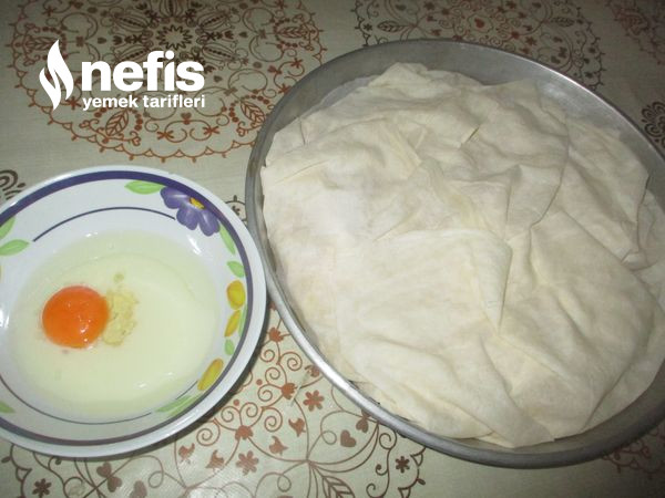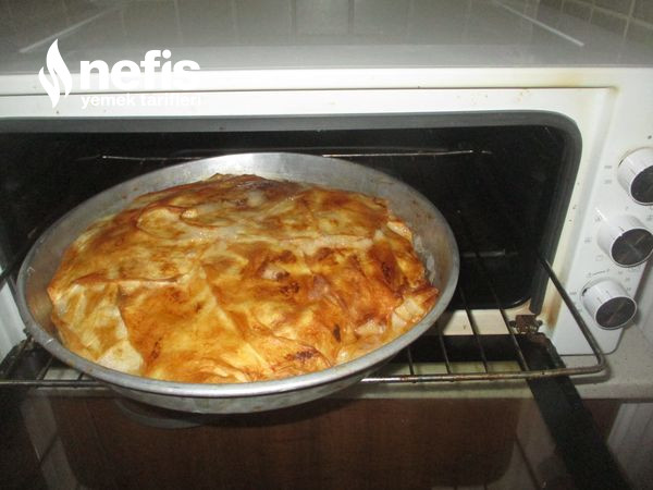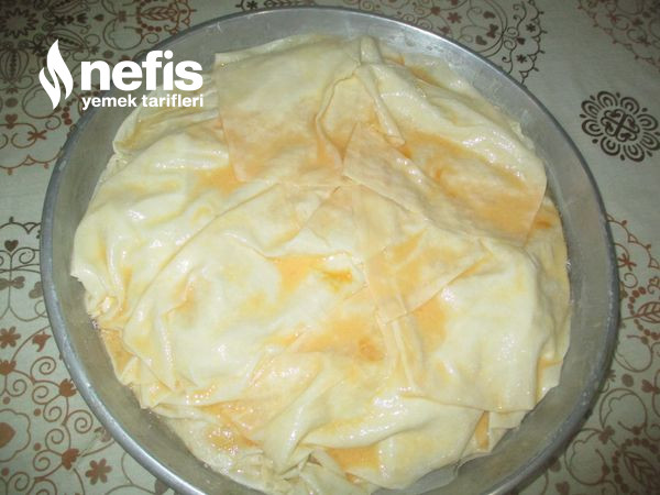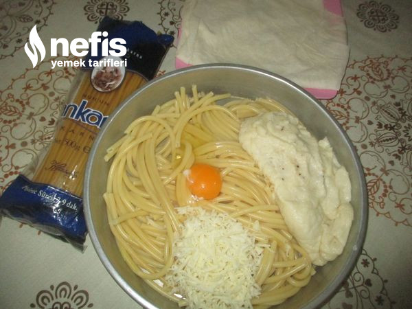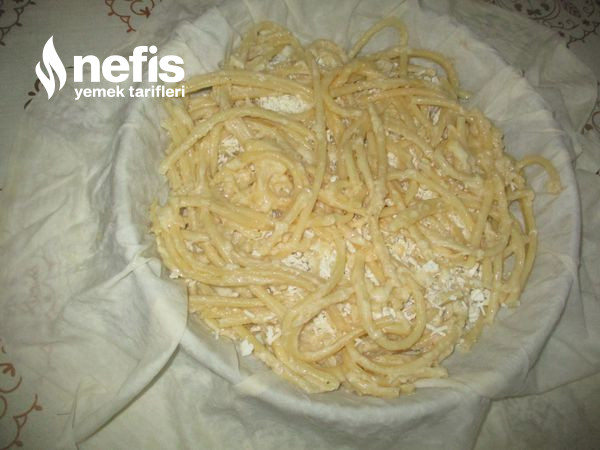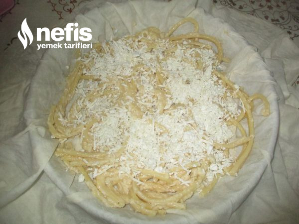 - Sonra yağlı kağıdı serdiğimiz tepsiye yufkayı serelim. Tepsiden fazlası taşsın. Makarnanın yarısı dökelim, peyniri serpelim, kalan makarnanın yarısı kapatalım, yufkayı içeri kapatalım, süt, yağ ,yumurta çırpalım, üzerine sürelim.