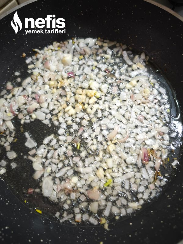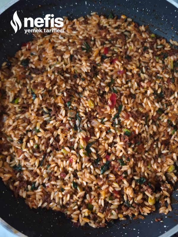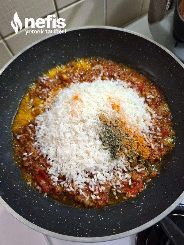- Yıkadığımız pirinci ekleyelim baharatları tuzu koyalım. Biraz daha kavuralım yeşil bir soğan ve maydanozlarımızı ekledikten sonra harcın üzerine bir buçuk su bardağı sıcak suyumuzu ekleyelim. Demlemeye bırakalım.