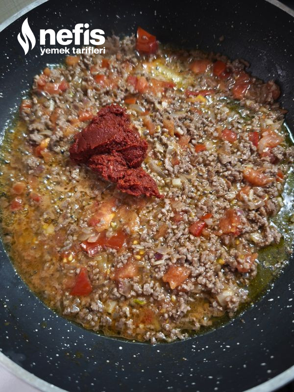 - İç harcı için tencereye yarım çay bardağı sıvı yağını alalım. Kuru soğanlarımızı koyalım biraz kavuralım kıymayı da koyalım üzerine salça domates koyup biraz daha kavuralım.