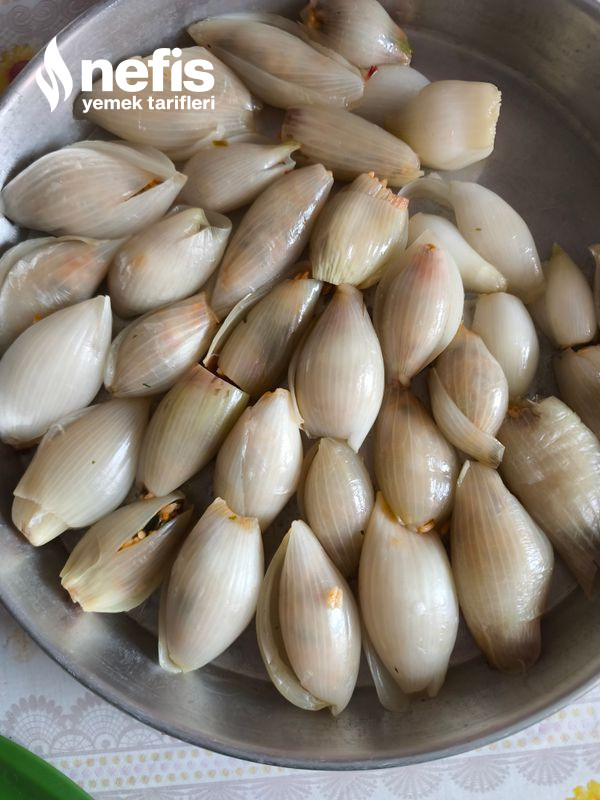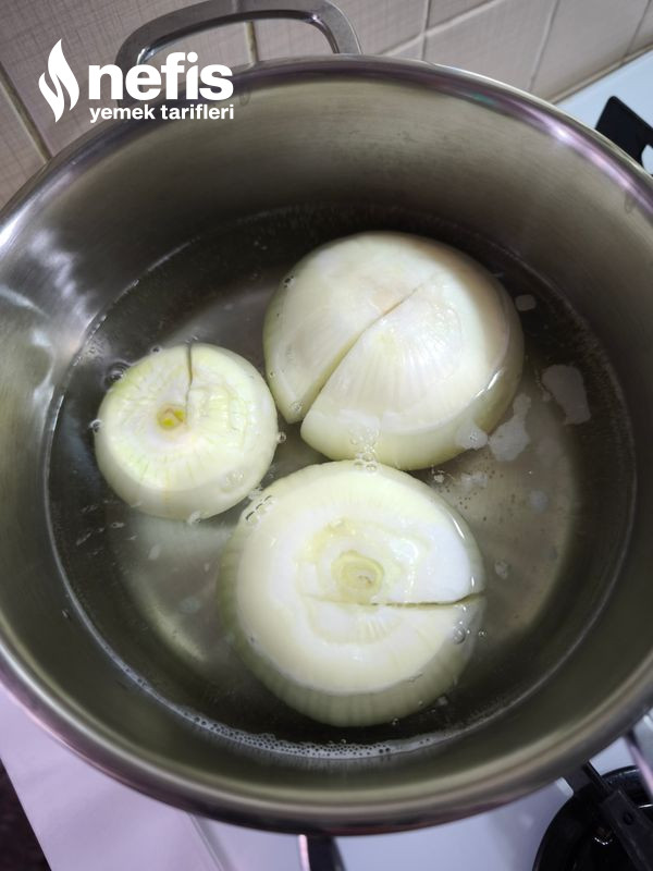 - Tencereye sıcak suyumuzu koyalım. Kuru soğanları yarım kesilmiş biçimde suyun içerisine atalım 15 dakika kaynatalım daha sonra sudan çıkartalım tek tek katmanlarından ayıralım.