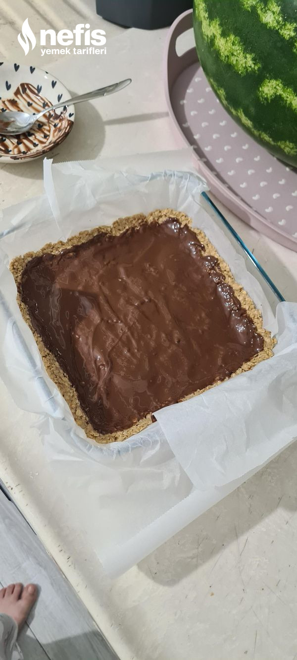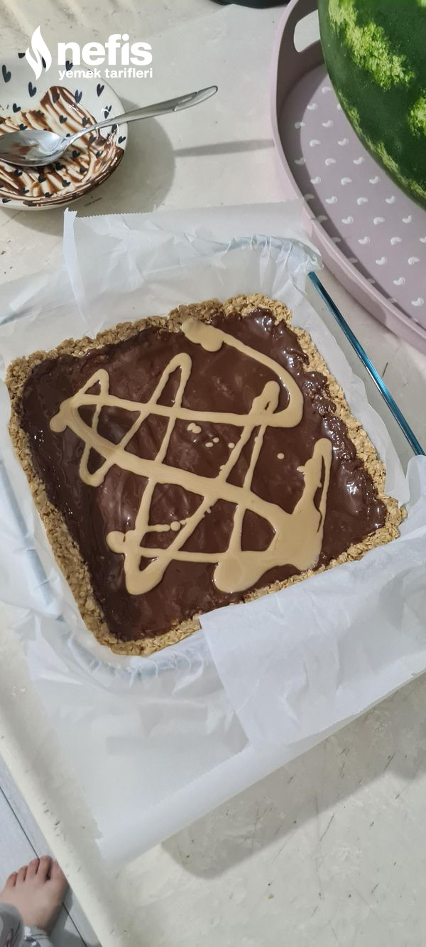 1. Yulaf ezmesi, bal ve tahini düzgünce homojen hale getirip, yağlı kağıt serdiğim borcama döşedim. Üzerine yumuşamış sürülebilir kıvama gelen çikolatayı yaydım ve tahin gezdirdim.