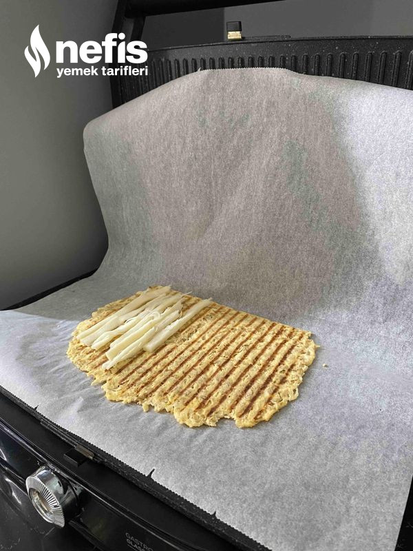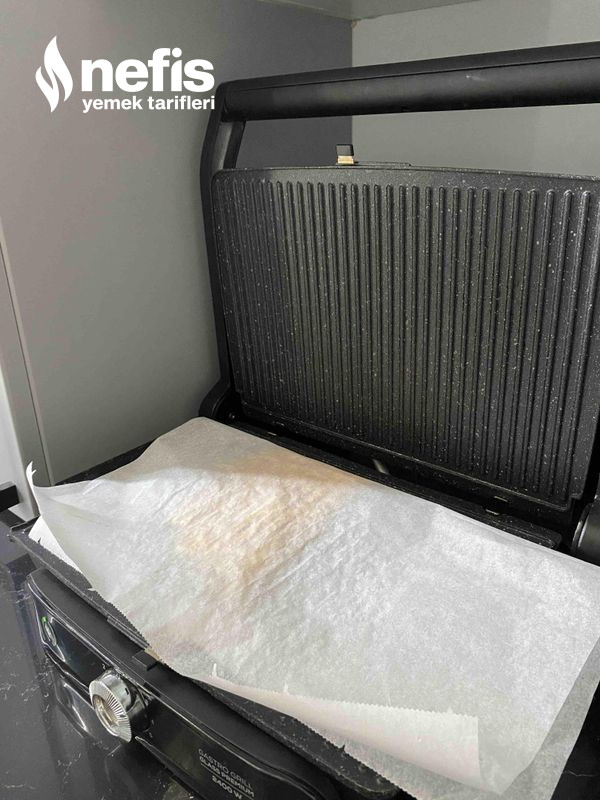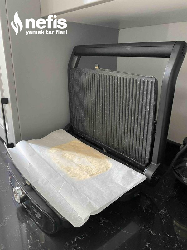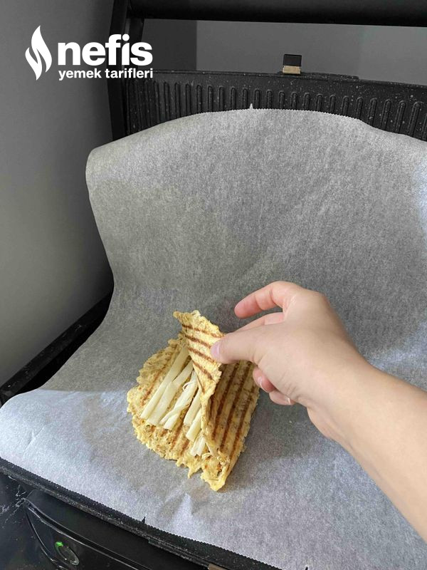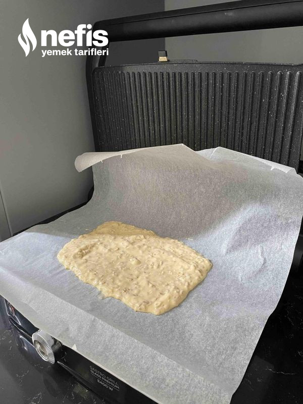- Tost makinesine yağlı kağıt koyup, hazırladığımız karışımı döküyoruz ve bir spatula yahut kaşık yardımıyla eşit formda yayıyoruz üzerini yağlı kağıtla kapatıp tost makinesinin kapağını da kapatıyoruz.