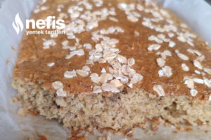 3. En son yağlı kağıt serili ince dikdörtgen borcama dökelim, üzerine yulaf serpiştirip evvelce ısıtılmış 180°c fırına alt üst koyalım.