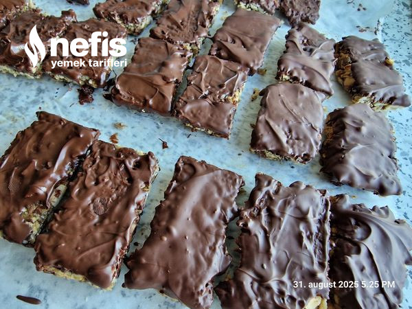 - Hazır olan dilimlerin taban kısmı erimiş çikolataya batırılarak soğumaya bırakılır. Buzdolabında durması daha hoş tat verir.