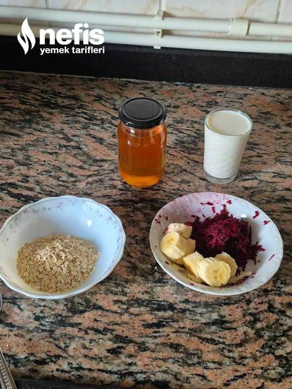 - Soğuyan karışıma ezilmiş muzu ve rendelenmiş kırmızı pancarı ekleyin. İsteğe bağlı olarak balı da bu kademede ekleyebilirsiniz.