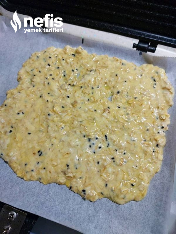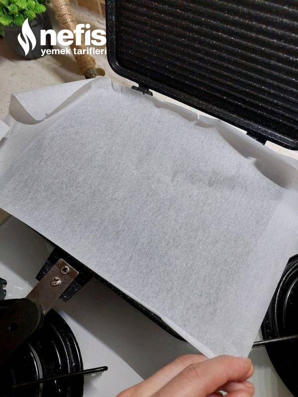 - Ardından tost makinesine yanmaz kağıdı serelim benim ocak üzerinde tost makinem var onda yaptım yanmaz kağıdı serince sıvı karışımı dökelim ve kağıdı kapatıp tost makinesini kapatıp gerili önlü pişirelim.