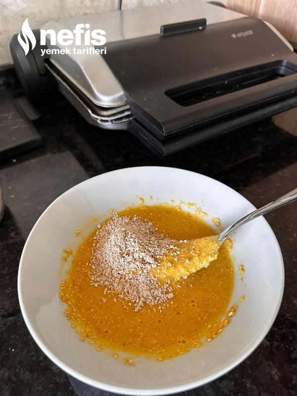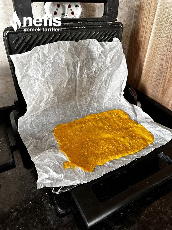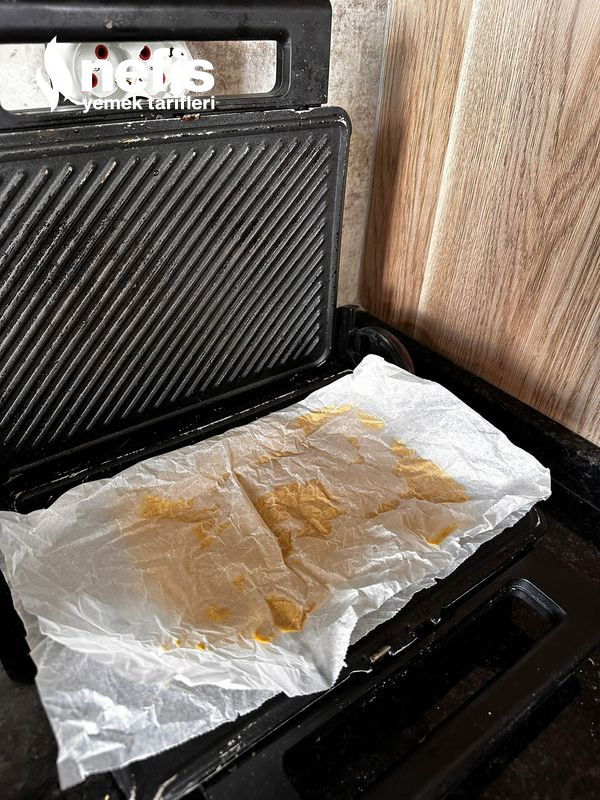 - Tost makinesine yağlı kağıdı koyup karışımı üstüne dikdörtgen formda yayıyoruz.