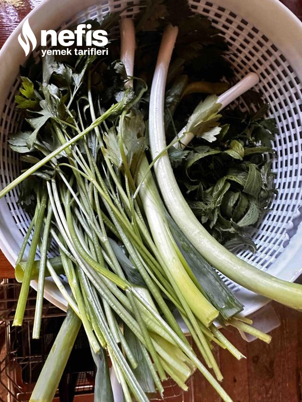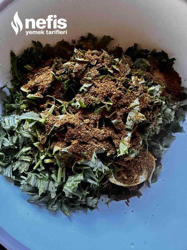 2. Maydanoz, nane ve yeşil soğanlar temizlenir ve yumurtaların üzerine doğranır.