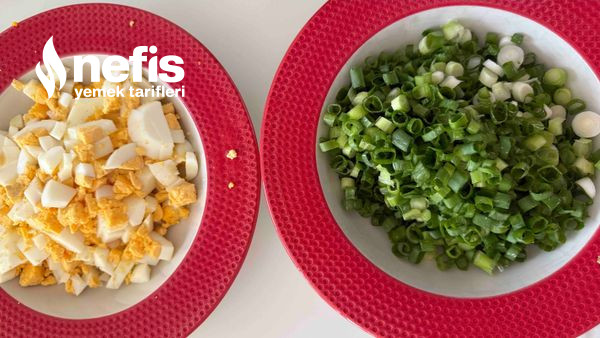 - Haşlanmış yumurtaları küçük doğrayıp ekleyin.