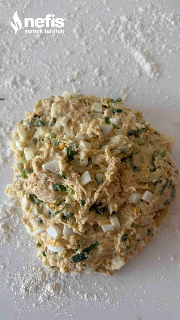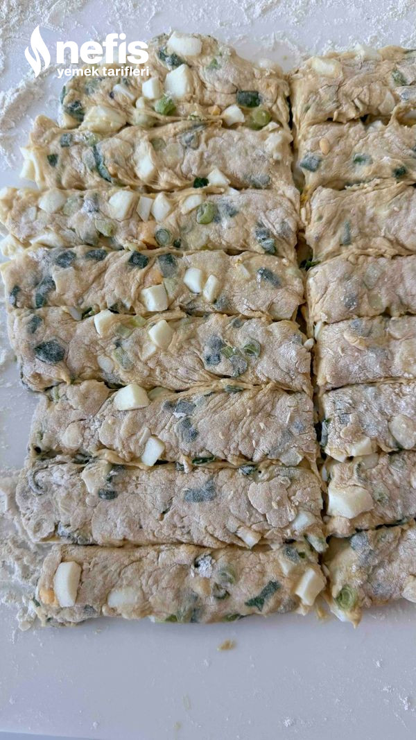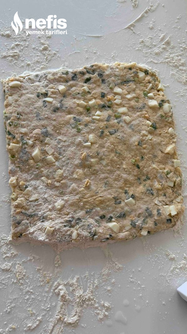 - Tezgahı unlayın, hamuru yerleştirin ve dikdörtgen biçim verin.