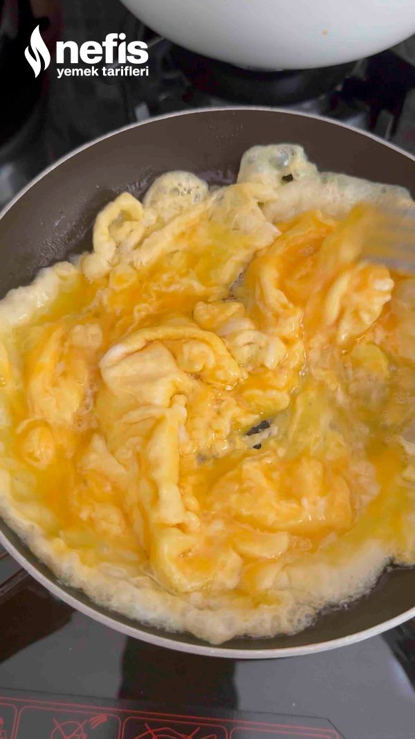- Derin bir kasede yumurtaları yeterlice çırpın ve kızmış yağın içine dökün.