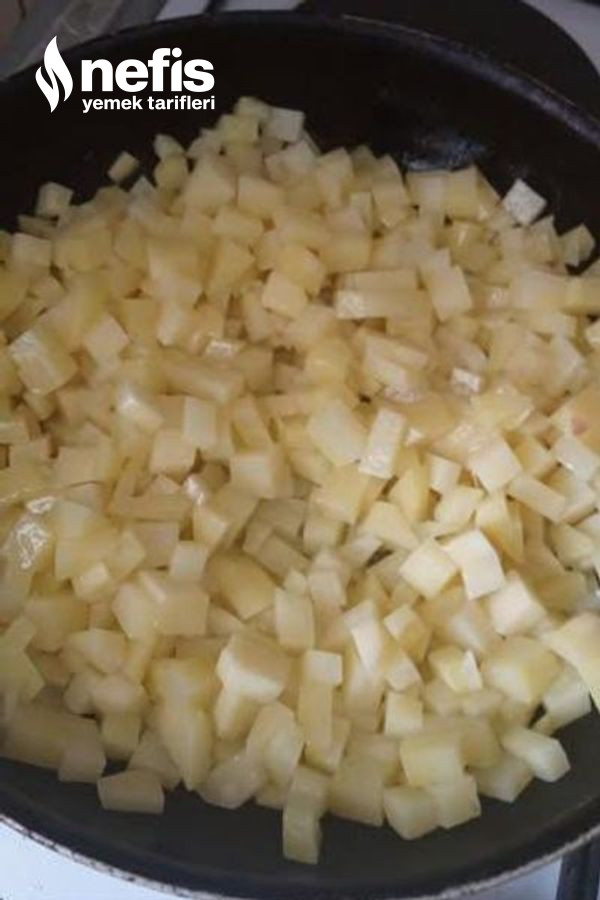 1. Patateslerimizi soyup küp küp doğruyoruz ve yağ koyduğumuz tavaya koyup karıştırıyoruz. Kapakla üstünü kapatıyoruz ortada gelip yapışmaması için karıştırıyoruz.