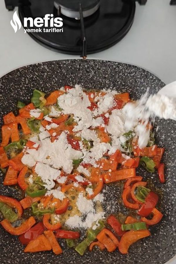 - Uygun bir tavaya sıvı yağ ve biberleri alıyoruz biberler kızarınca unumuzu ekleyelim ve hafif kavuralım sütü ek edelim tuzu ekleyelim.