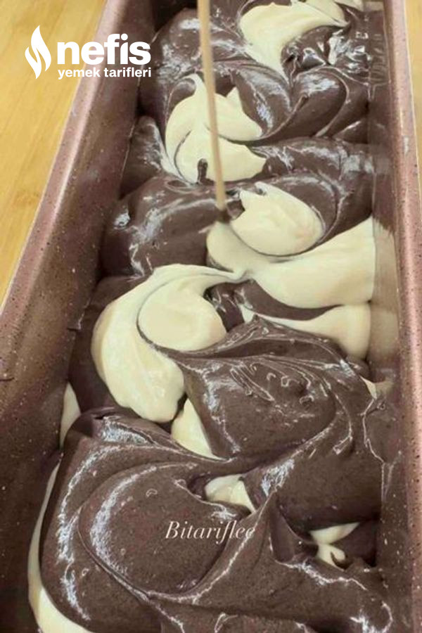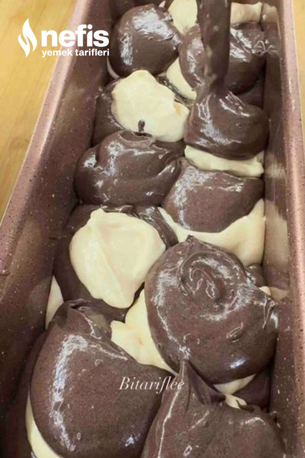 4. Tereyağı ile yağladığımız baton kek kalıbına birer tatlı kaşığı her iki karışımdan bir beyaz, bir kakaolu karışım olmak üzere sıralı olarak dökelim.