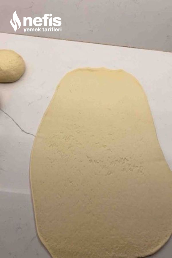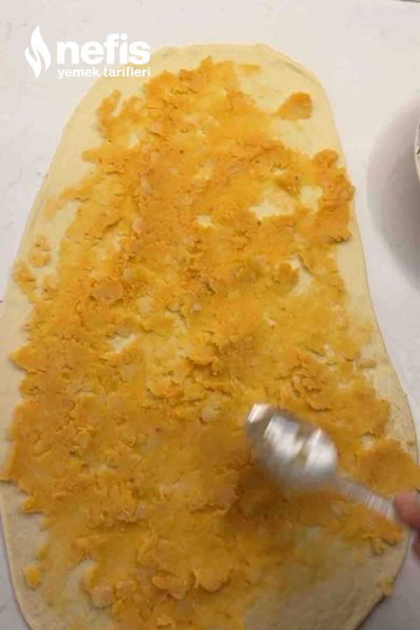 - Mayalanan hamurun havasını aldırıyoruz ve 4-5 modüle eşit olarak bölüyoruz. Bezeleri yuvarlayıp kenarı alıyoruz. Birinci bezeyi tezgaha alıyoruz. Hiç unlamadan uzunlamasına yanlışsız bezeyi açıyoruz. (dikdörtgen formda düşünün) ortasında patatesli harçtan ekliyoruz ve her tarafına eşit gelecek halde yaydırıyoruz.